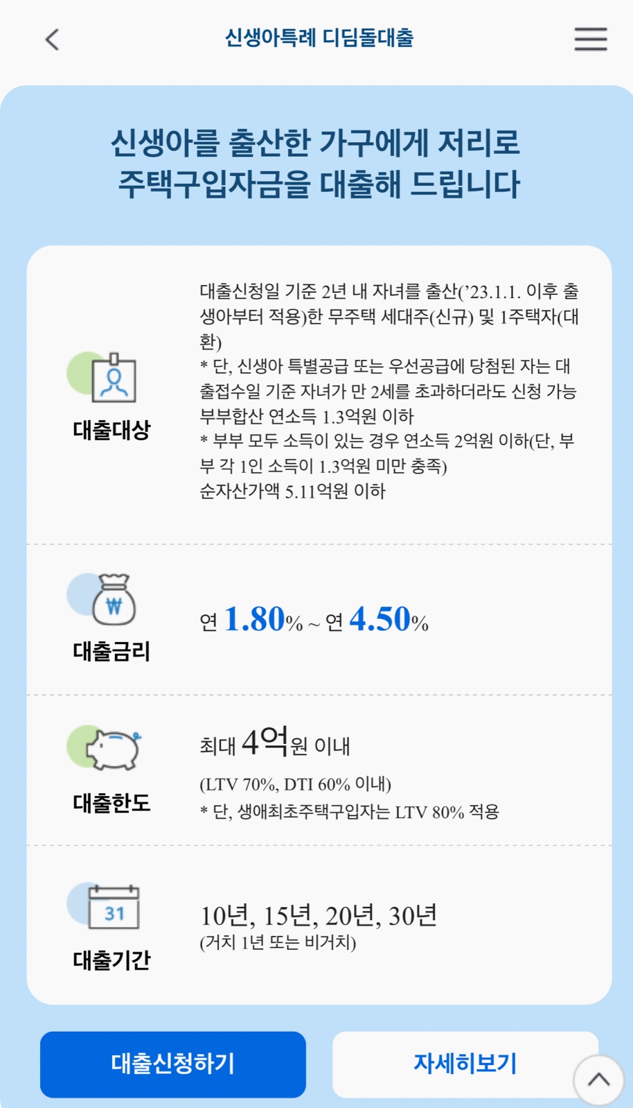 신생아특례대출은 신청일 기준 2년 이내에 출산 가구, 맞벌이 부부 합산 소득 2억원 이하, 주택 면적 85제곱미터 이하면 최대 4억까지 신청할 수 있는데요.